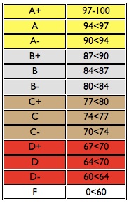 C: Work attaining this grade will incorporate some but not all the relevant material from lectures, readings, video clips, and discussions, which you will be expected to synthesize, and properly articulate in answering questions.
